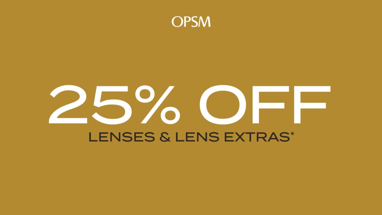 Take advantage of 25% off lenses and lens extras* when purchased with a frame at OPSM. Discover the wide range of designer frames to elevate your style and premium lenses tailored for you. *When purchased with a frame. Further T&Cs apply, see staff for details.